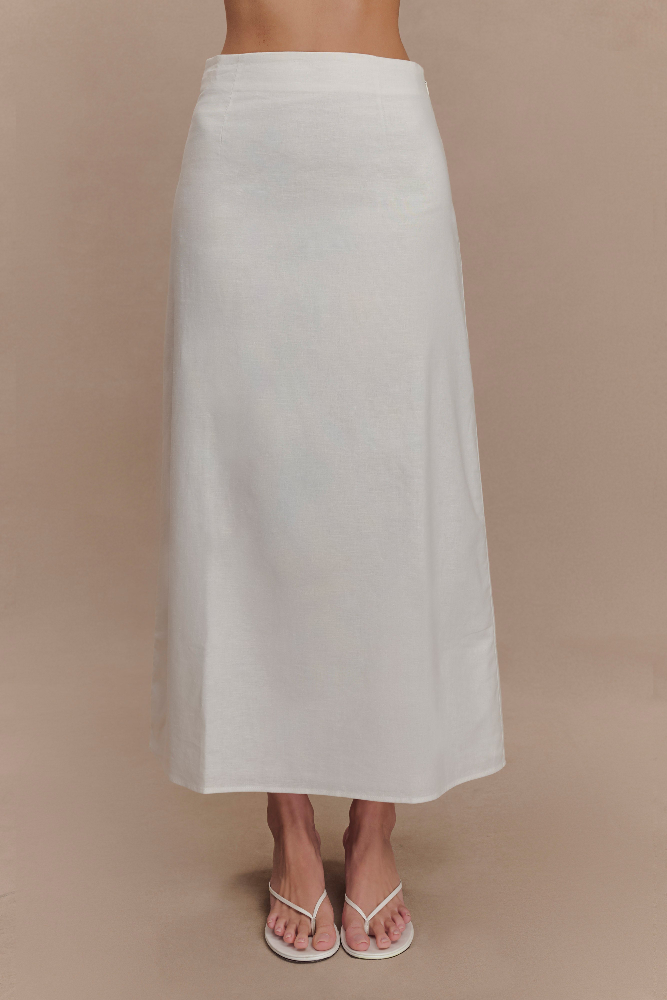 Elevate your wardrobe with the DORA Linen Midi Skirt, a refined blend of classic silhouette and effortless style. This high-waisted skirt features an A-line shape that flatters the waist and falls gracefully to a midi length, perfect for day-to-night versatility. Fully lined for comfort, it offers a smooth fit and a sophisticated drape. The convenient side zip ensures easy wear, making it a go-to piece for polished yet relaxed looks. Pair it with the Dora Strapless Linen Top for a coordinated, chic ensemble.