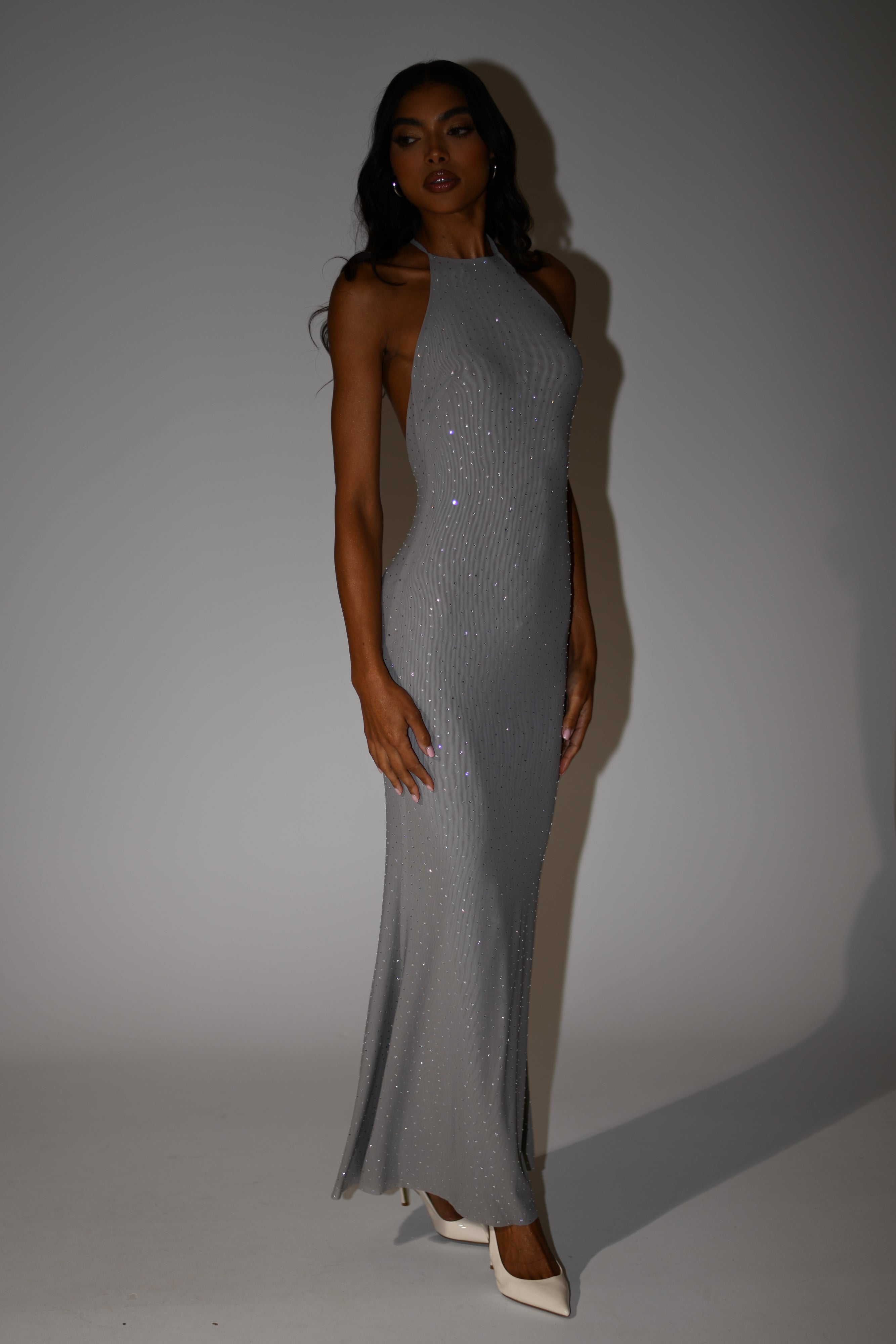 The KALI is a halter maxi dress adorned with diamante detailing on its slightly sheer mesh. This gorgeous maxi features a halter neckline with delicate straps cascading and teasing on its sexy low back when tied. It is fully lined for a sleek finish, further refining its stretchy fabric and bodycon fit.