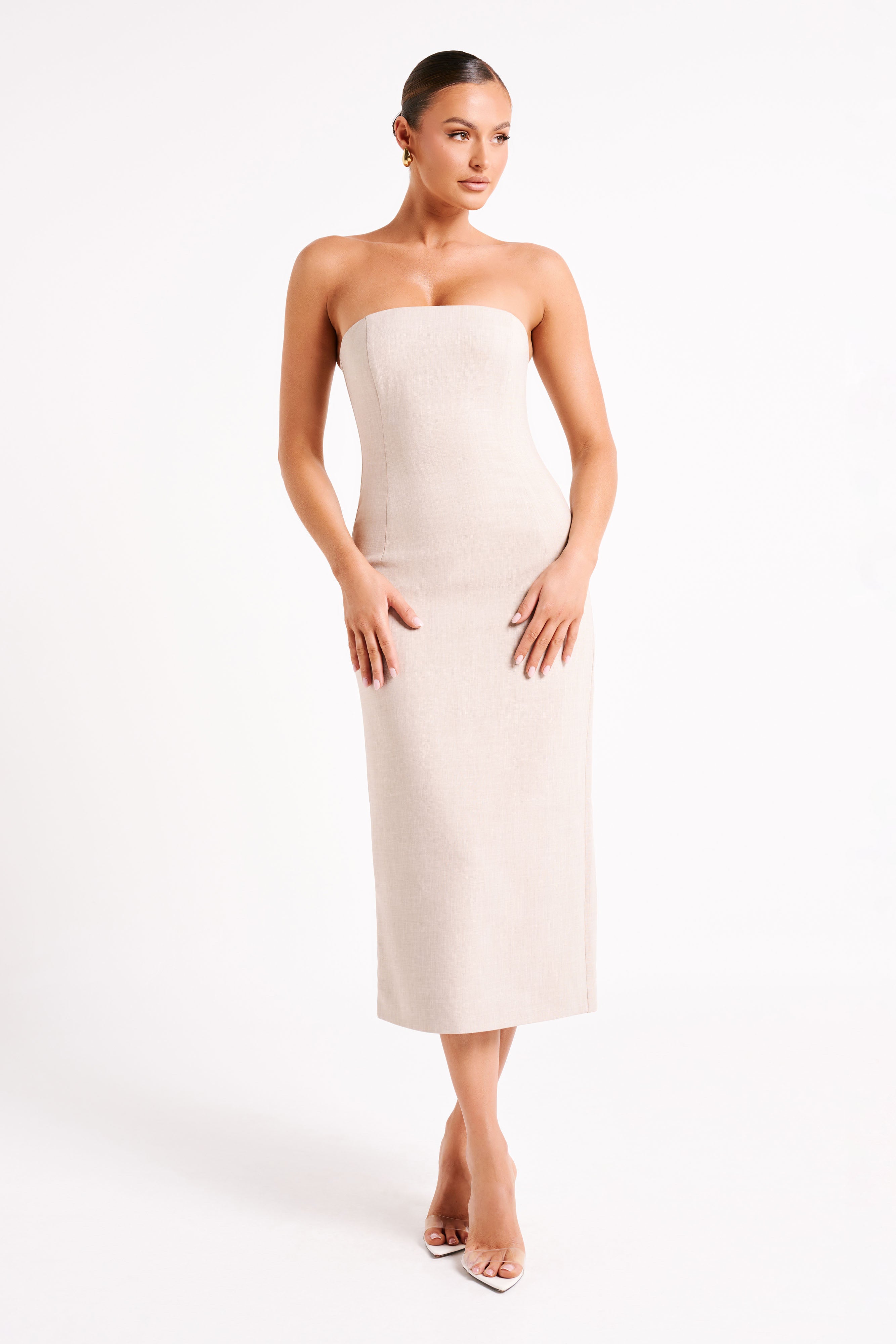 SABLE is a long, strapless midi dress with a back hem vent and contoured seams. It closes via an invisible side zipper for a clean, seamless silhouette. Its lined, textured fabrication adds visual depth to the look without clashing with the clean, minimalist vibes. Sexy, sleek, and yet still tastefully classy, Sable is a stunning desk-to-dinner option when you add the Brandy Ankle Strap Heels.