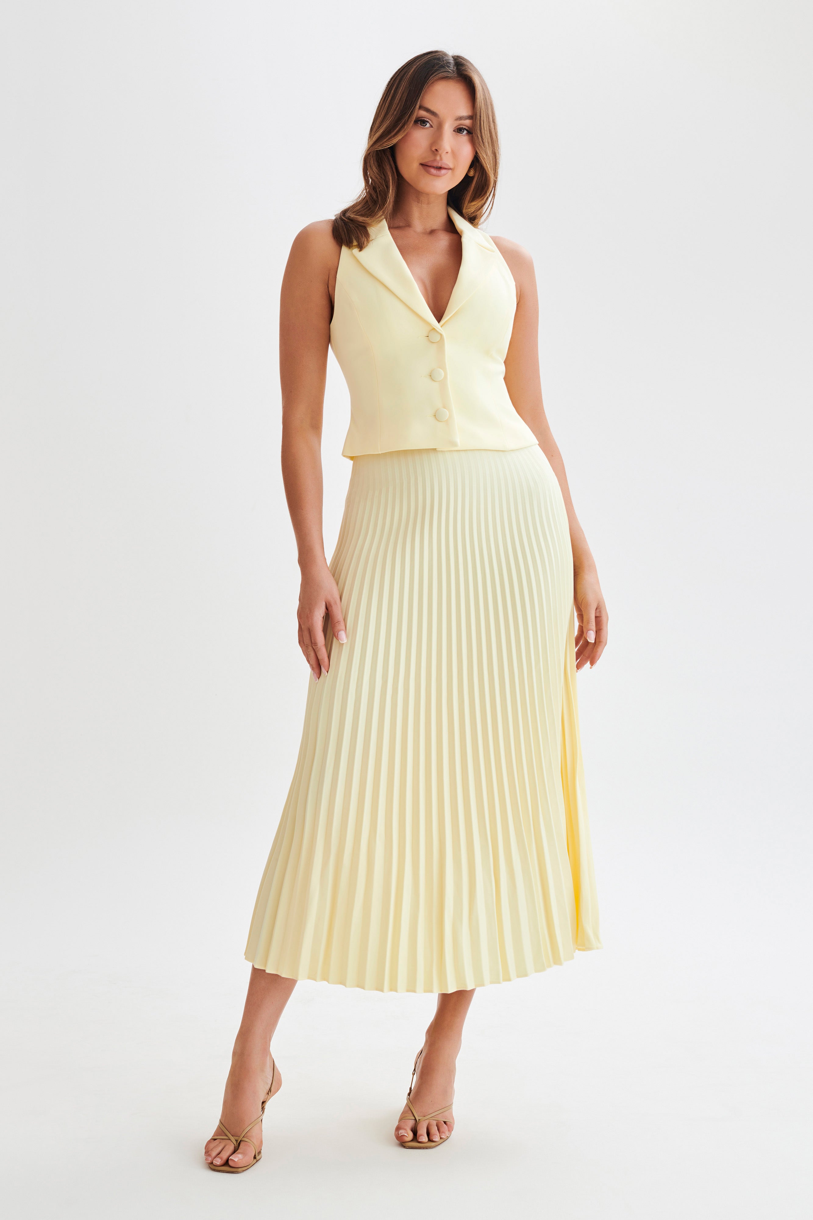 This is a full-length maxi skirt with an invisible side zipper and waist-to-hem pleats. Fresh and versatile, its polyester-and-elastane fabrication allows it to look loose and flowy without losing its structure. Small details like the fitted waist and pleated hem for visual appeal but at a timeless length. Pair with the Fleur Thin Strap High Heels to dress up the look.